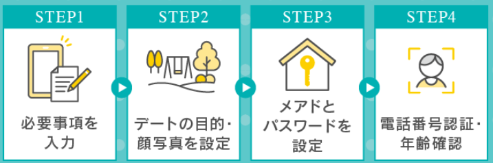登録画面の案内に沿って、ニックネーム・お住まいの地域・性別・生年月日・デートでやってみたいこと・出会うまでの希望などを入力します。これらはマッチングの精度に関わる大切な項目なので、できるだけ正確に記入しましょう。